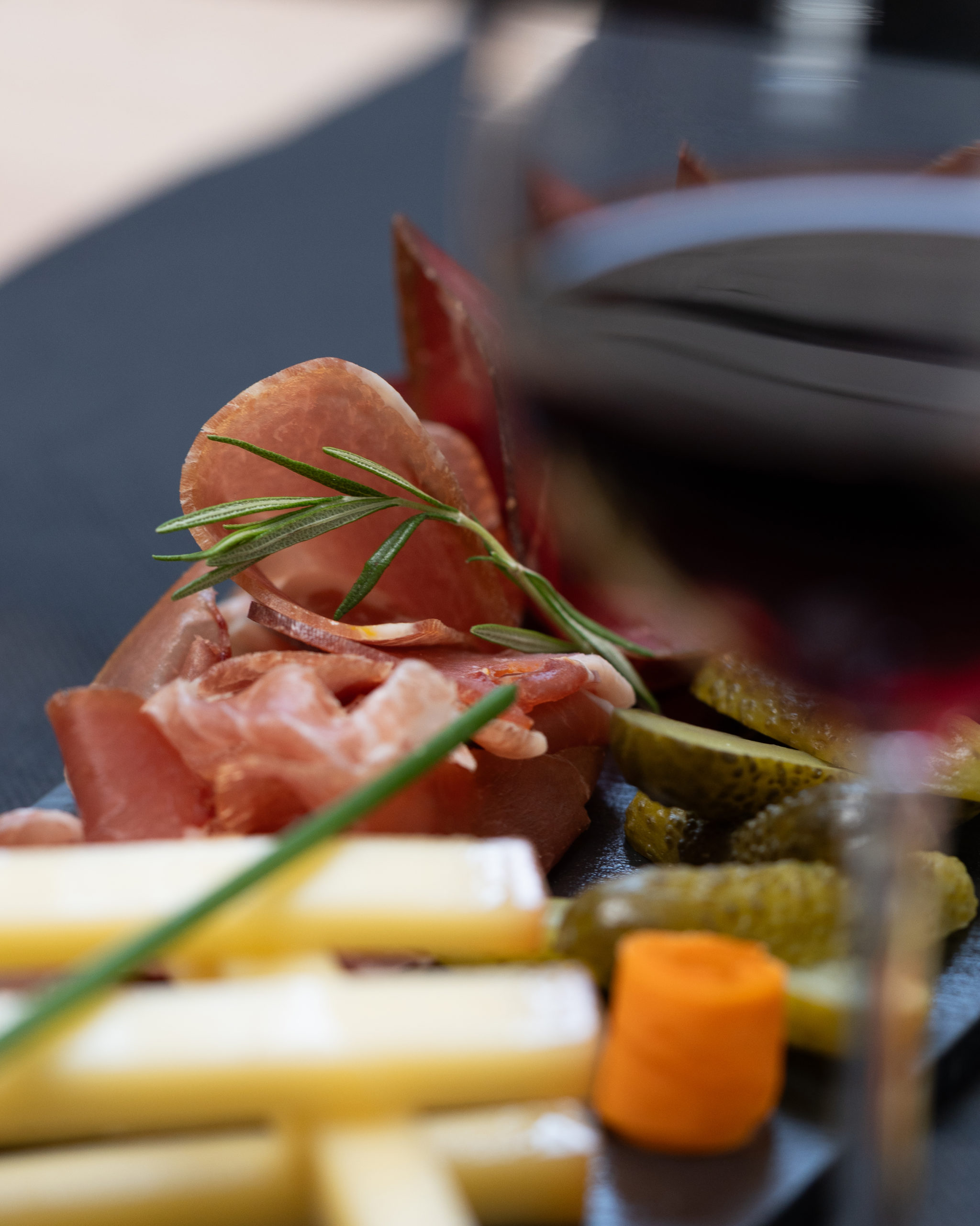 Assiette de charcuterie espagnole traditionnelle, dont jambon ibérique affiné pendant 18 mois, accompagnée de tapas de tapenade, de pan con tomate et de tortilla.