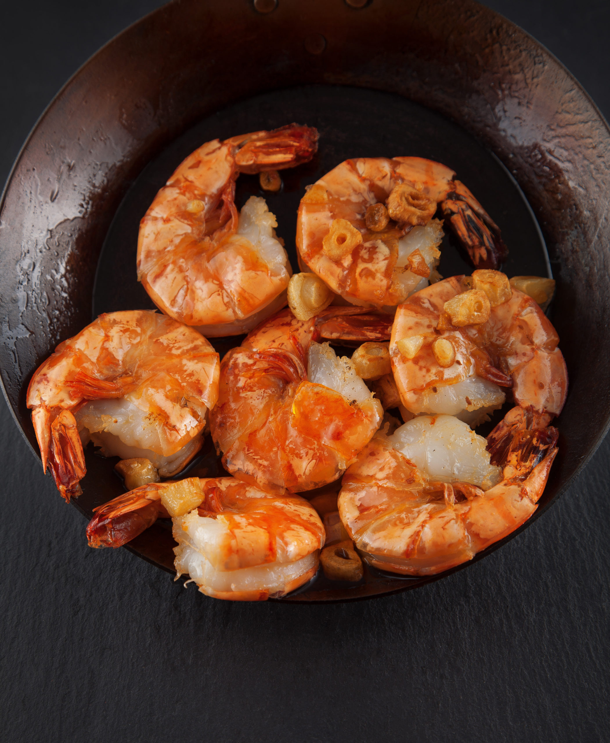 Gambas grillées et assaisonnées selon la recette Alegria, servies avec des frites maison.